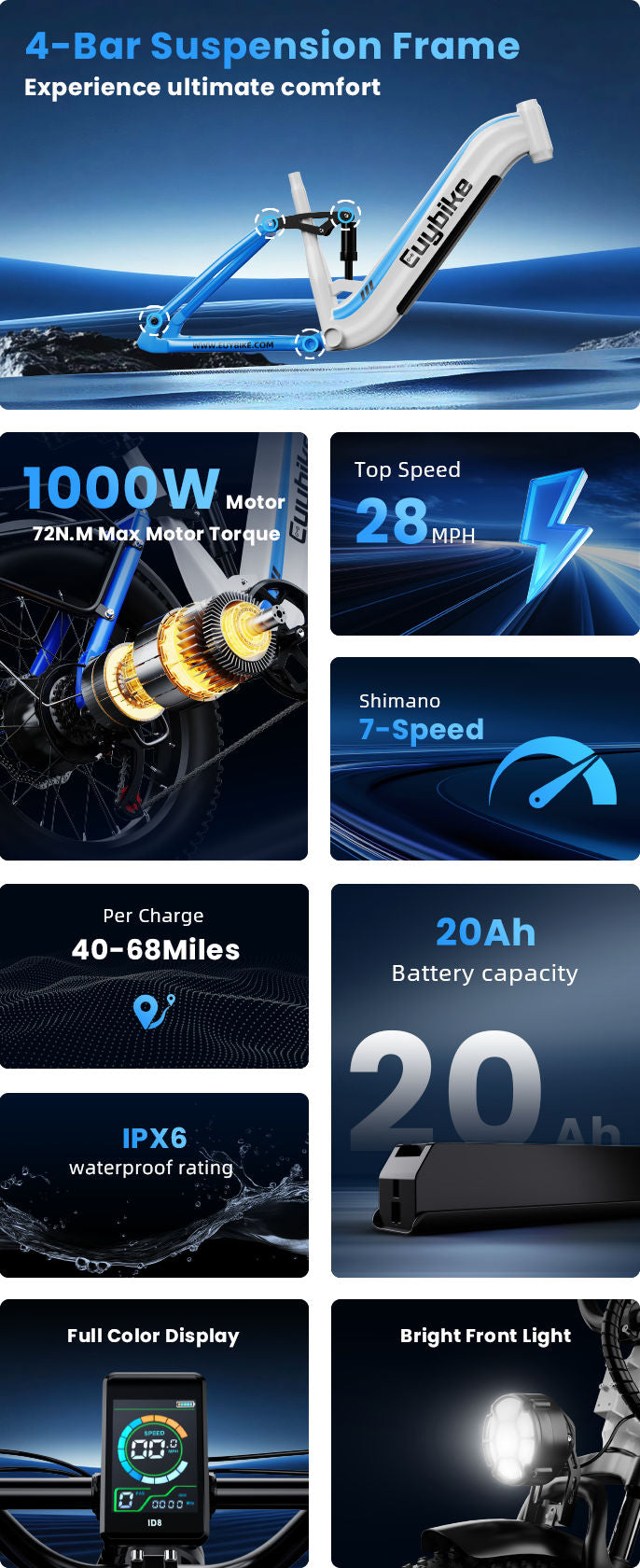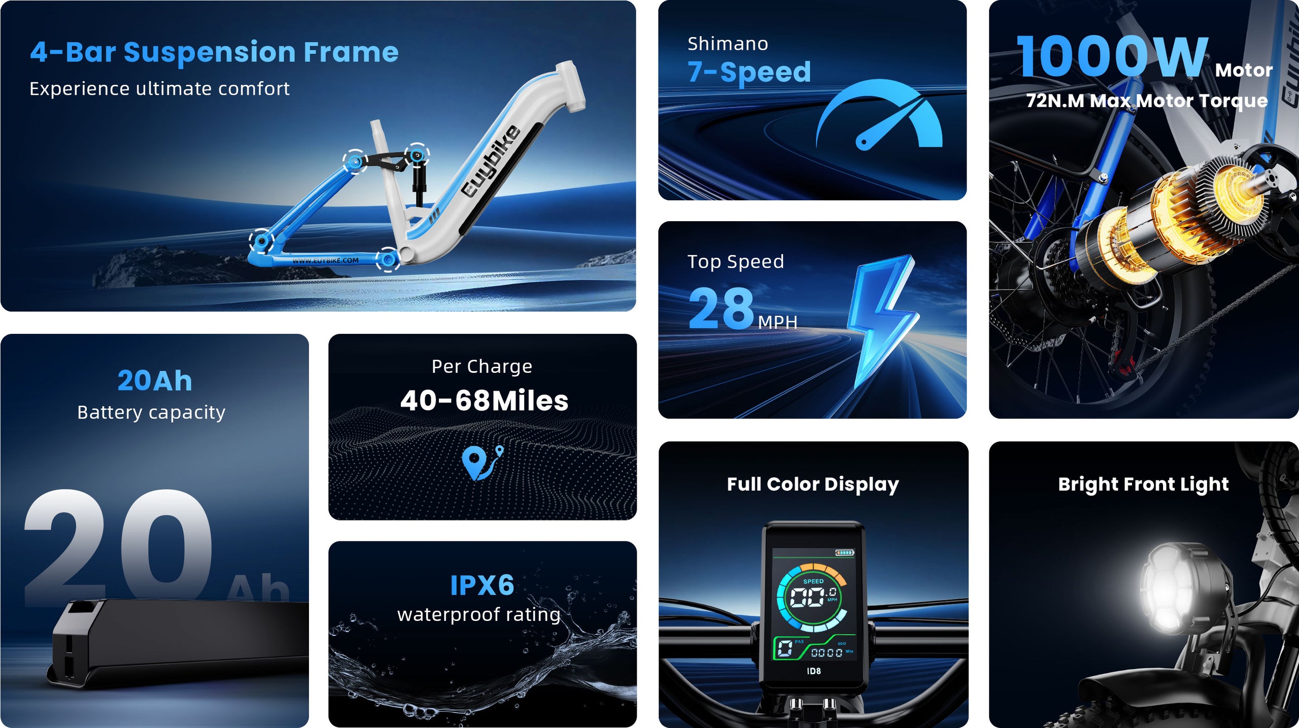 The Euybike C3 full suspension ebike is engineered for the rider who demands it all. Equipped with a 48V 20Ah battery and 1000W motor, it meets your needs in terms of range and power. The C3 offers exceptional full-suspension performance, making it the key to effortless journeys.