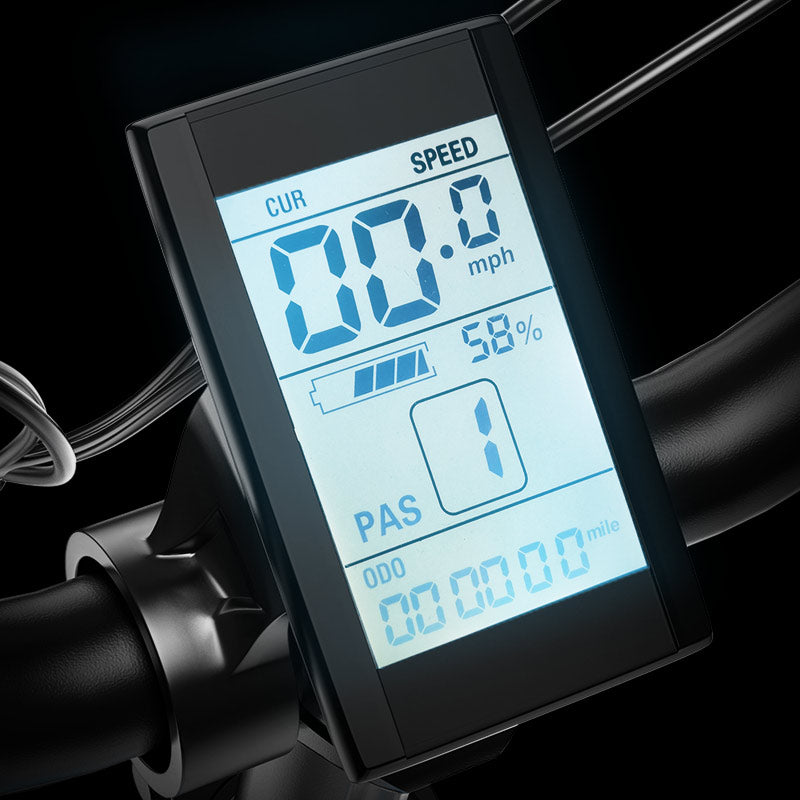 The backlight display provides information such as battery capacity, speed, riding mode, total mileage, and more. The "︿" and "﹀" keys adjust the assist gear.