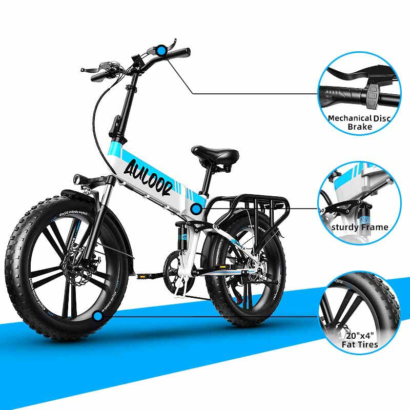 The Auloor All-Terrain Fat Tire Electric Bike equipped with a powerful 750W motor, mechanical brakes, and a mid-mounted shock absorber. These features make it ideal for tackling all kinds of terrain, from rocky trails to beaches.